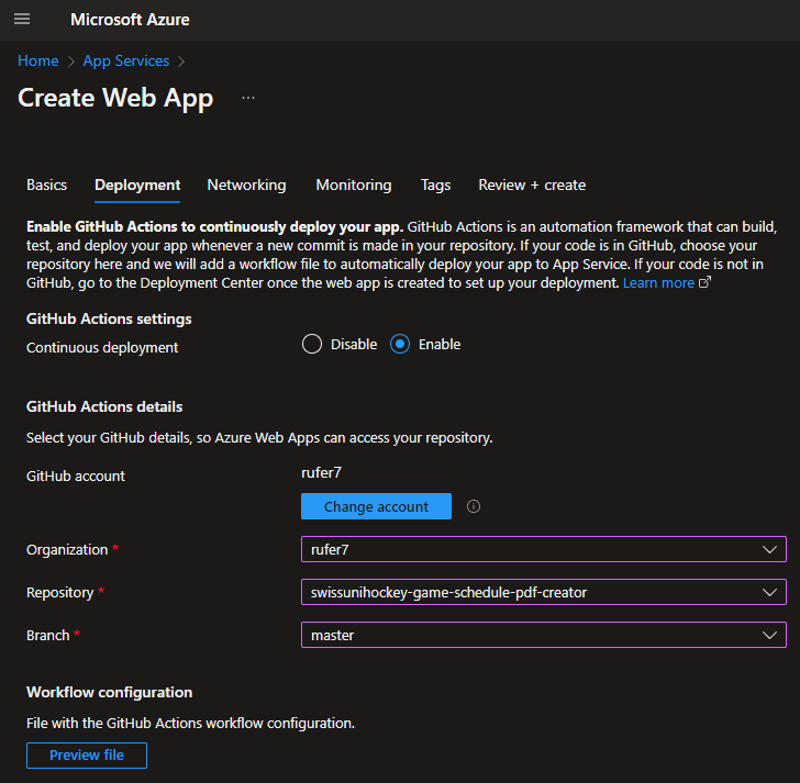 When I continued to the Deployment tab of the web app creation wizard, I was again impressed by Azure – especially from the support in setting up automated deployments. I just enabled Continuous deployment option, selected the GitHub organization, repository and branch and during creation of the web app (Azure App Service) resource, a GitHub Actions workflow got set up by Azure that automatically builds and deploys the Java spring boot application to the corresponding Azure App Service on every commit to the selected branch!