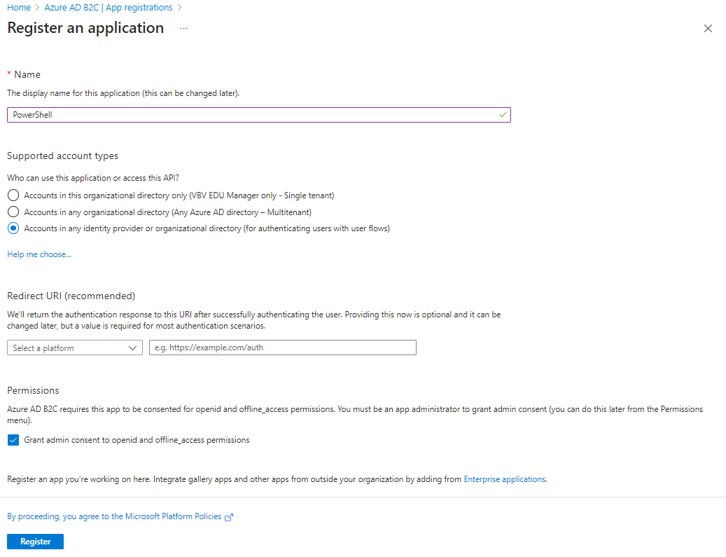Grant admin consent for B2C_TENANT_NAME - Open PowerShell