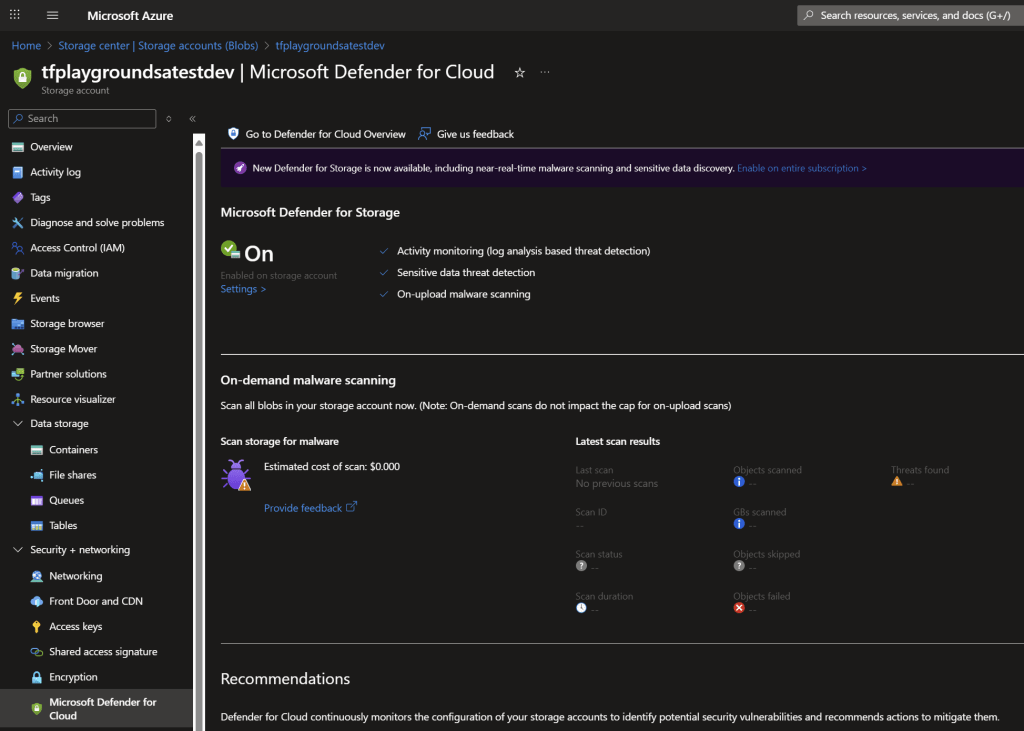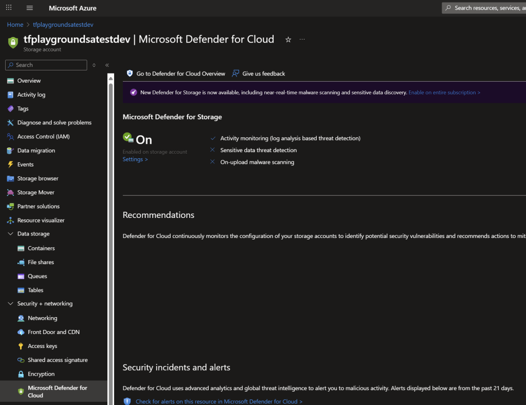Recently, I wanted to enable Defender for Storage on a dedicated storage account using Terraform. Since I already did this some time ago, I looked up the existing solution. After updating the terraform configuration based on the existing solution, I applied the updated configuration to the infrastructure.