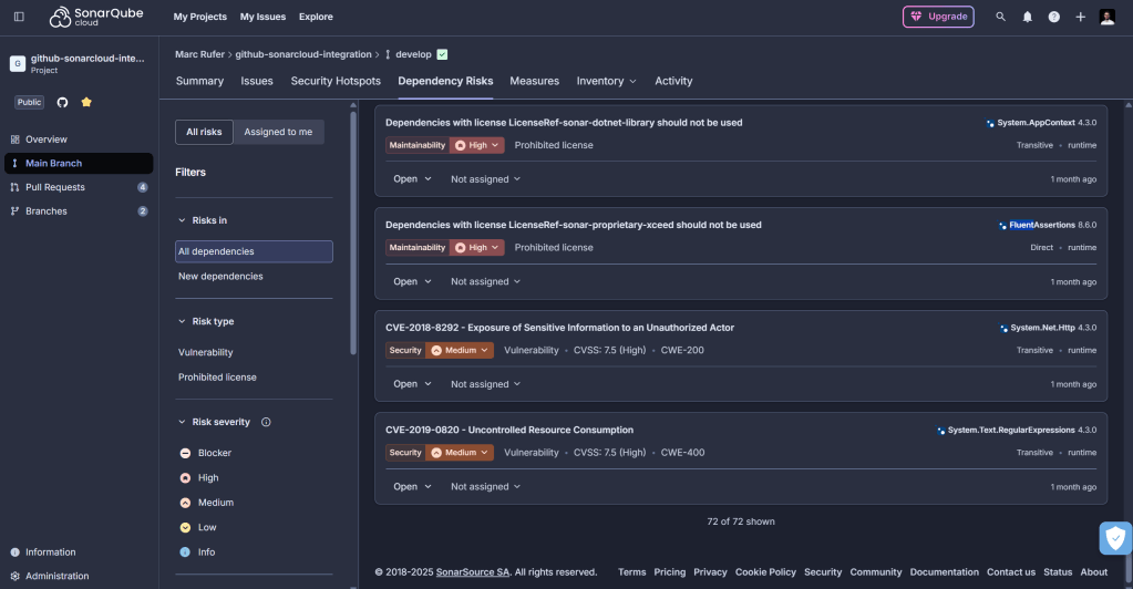 If activated, there is a new tab in SonarQube Cloud called Dependency Risks which shows the dependencies that are not compliant with the license profile you selected.