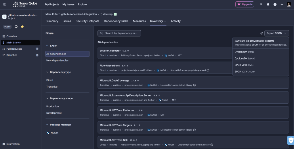 Here you can find a list of all dependencies (including transitive dependencies) of your source code including the possibility to export this list to a standardized format like CycloneDX (JSON or XML) or SPDX 2.3 (JSON or XML).